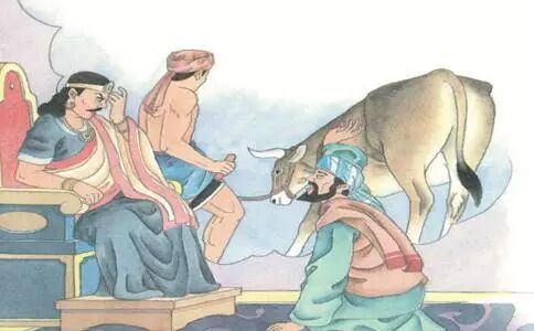 這時大臣測知國王心軟,於是稟告說:「大王!要不然可以找看看,這群牛中,在將被殺時,如果還能行淫就必須讓牠死。」正將要設祭會的時候,有一頭雄牛與一頭雌牛共為淫事。大臣說:「這兩頭牛應該殺。」他的五百弟子也同時舉手說:「該殺!」大臣的太太也贊同地說:「牠們該殺。」這兩頭牛於是被殺來供設會。